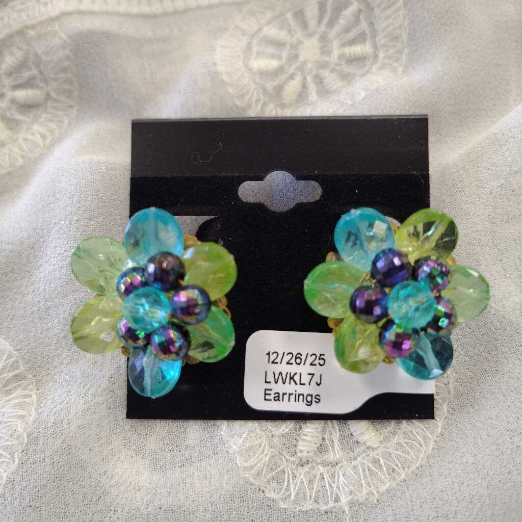 Gold tone stud clip back earrings with green, teal, and purple faceted flowers.