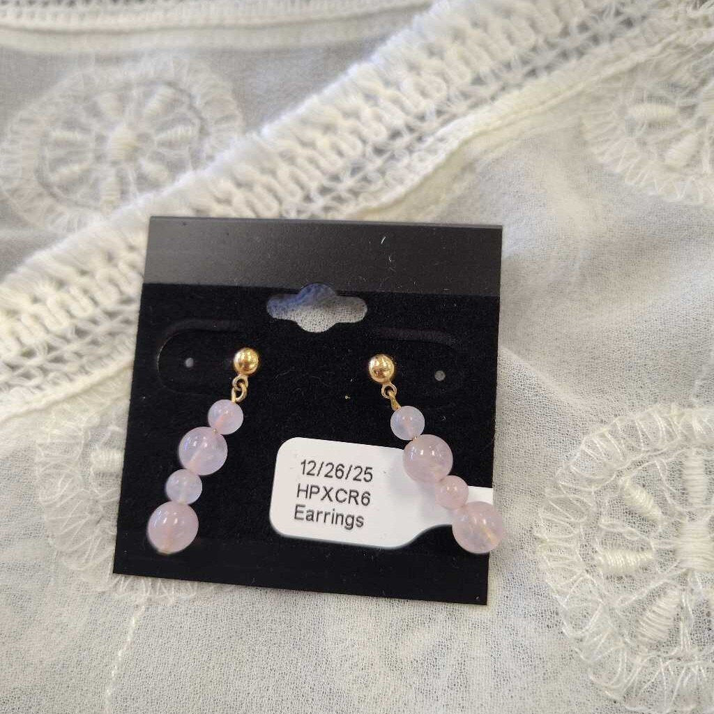 Gold tone dangle pierced earrings with pink quartz round beaded drops.