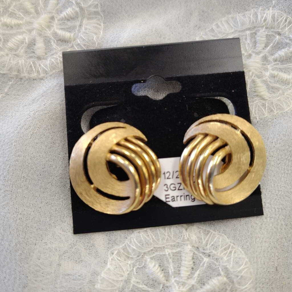 Gold tone swirl pierced stud earrings, brushed and shiny.