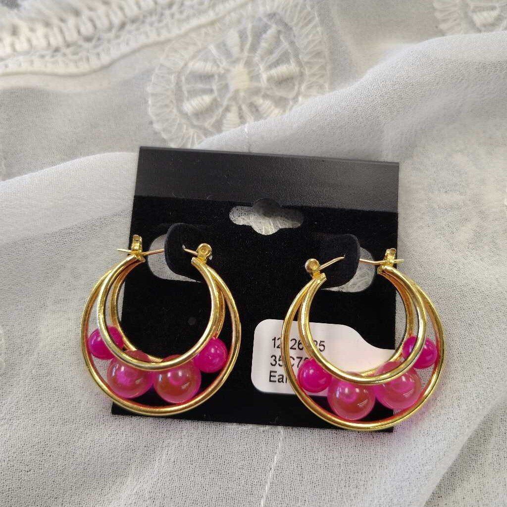 Gold tone dangle pierced hoop earrings with pink ball bead accents.