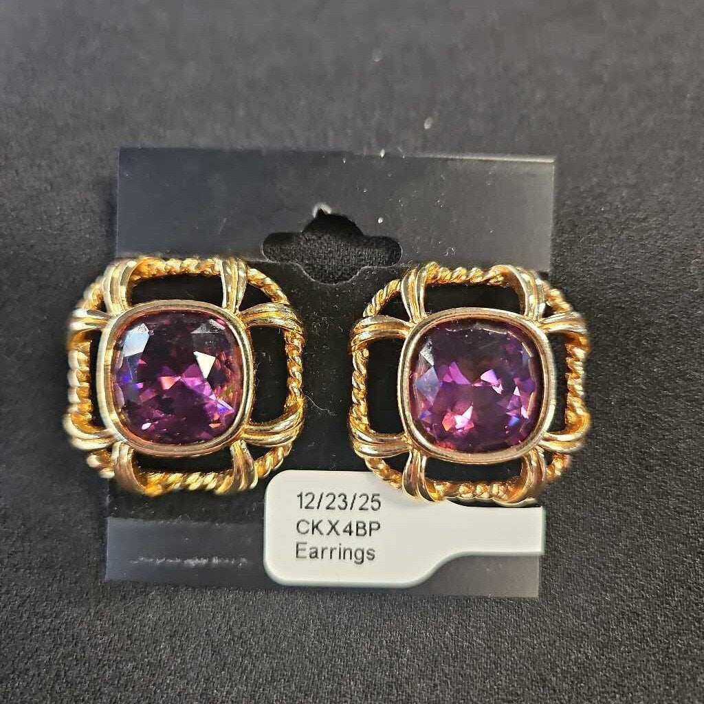 Large square gold tone stud pierced earrings with purple faceted centers.