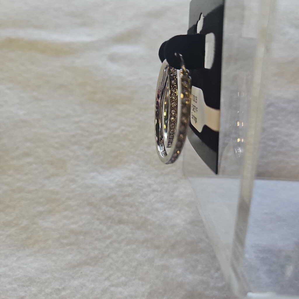 Silvertone hoop dangle pierced earrings with rhinestone accents.