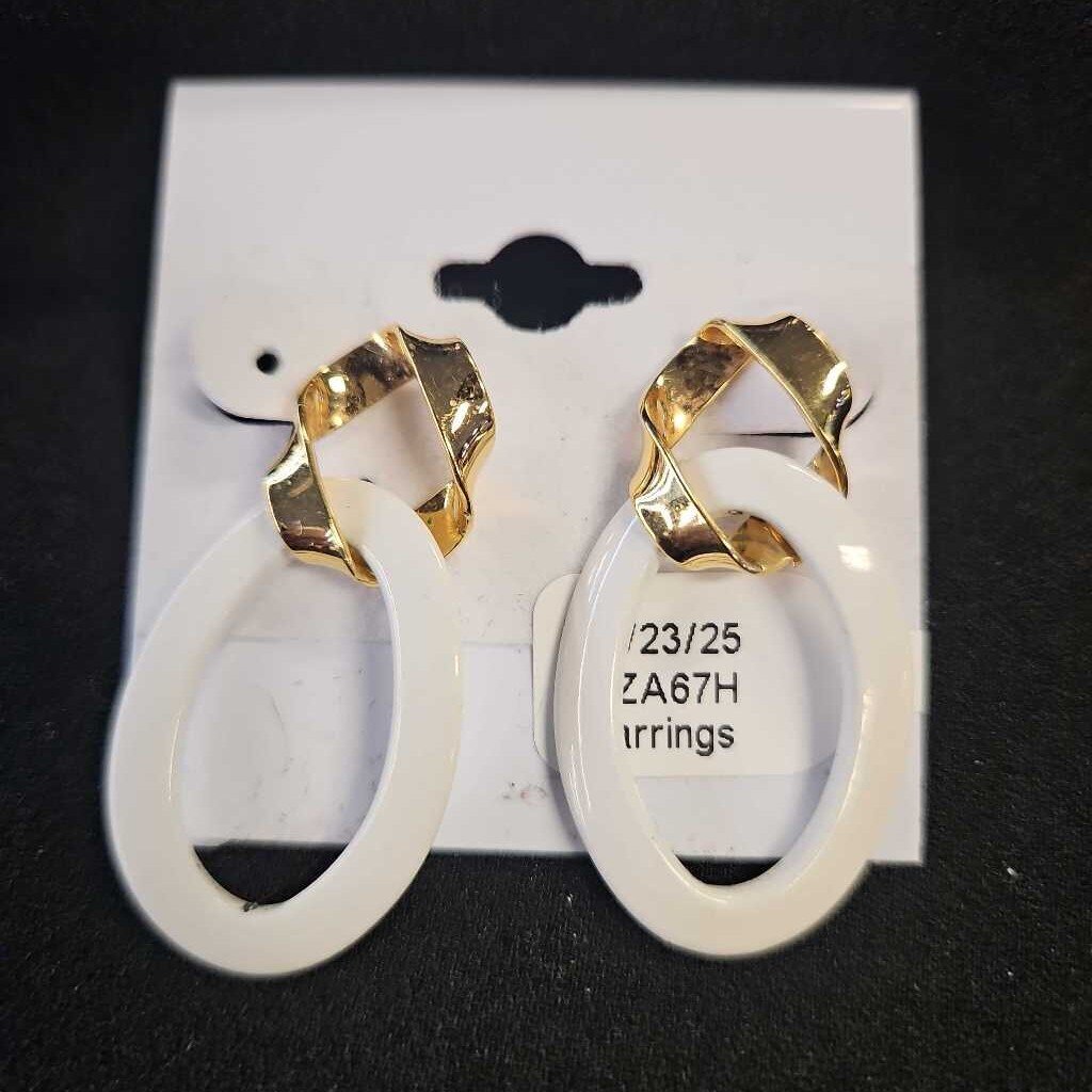 White oval hoop earrings with gold tone posts, dangle pierced earrings.