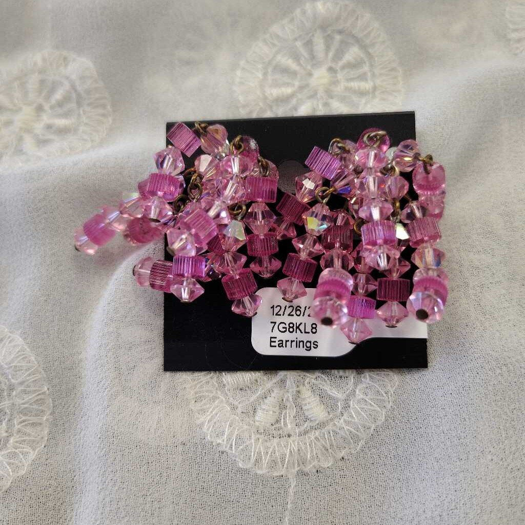 Pink faceted cascade crystal clip on earrings with silver tone hardware.