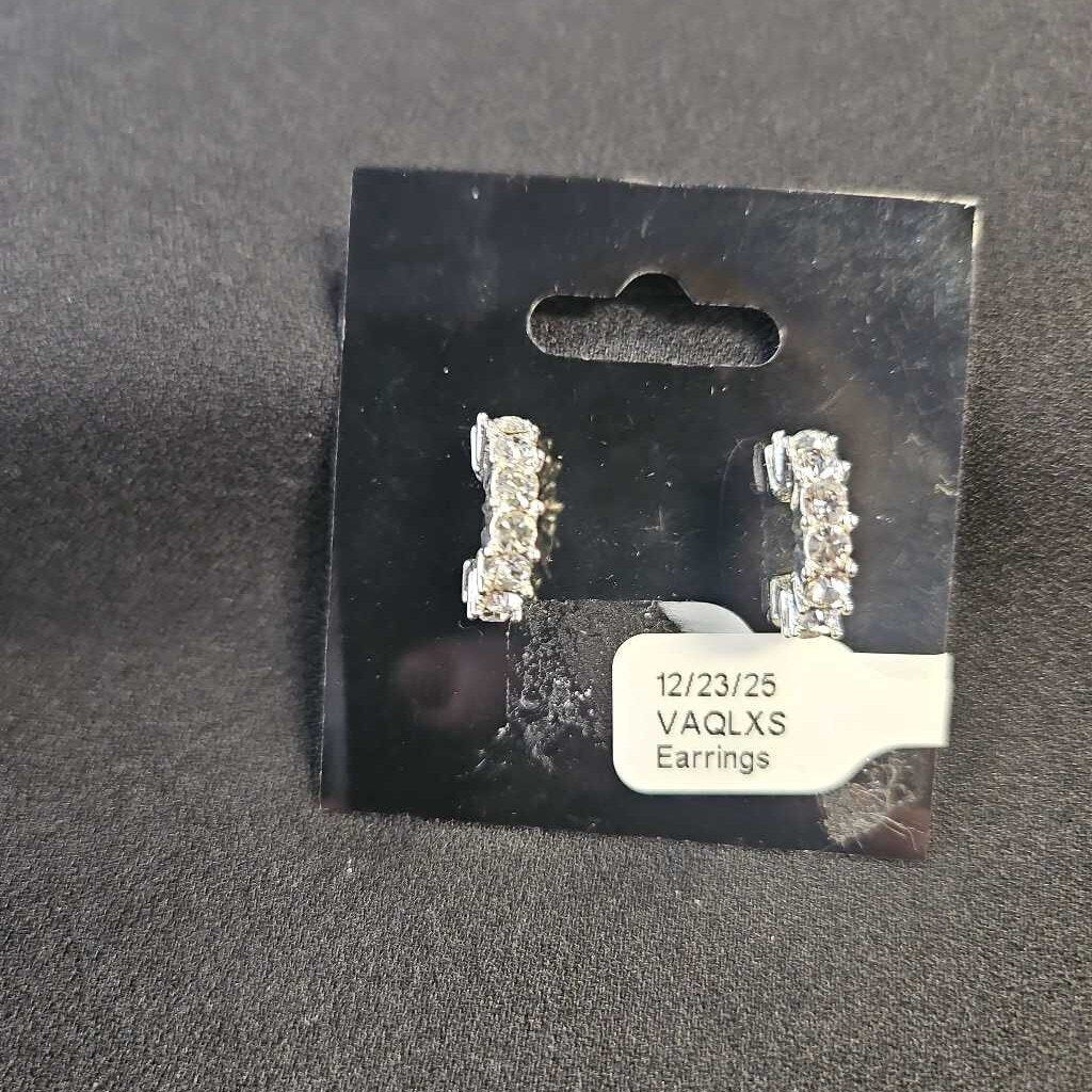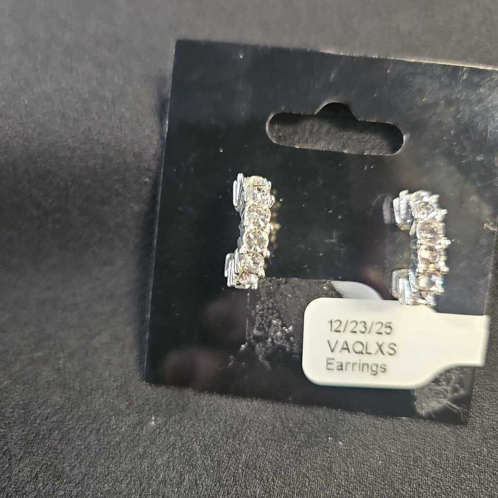 Silver tone small hoop dangle pierced earrings with rhinestone accents.