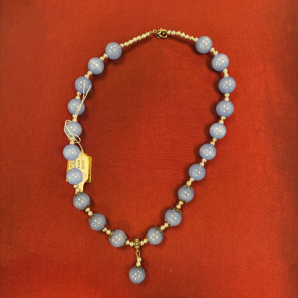 Small silver tone beads with larger blue beads and a dropped blue bead pendant. No info from consignor.