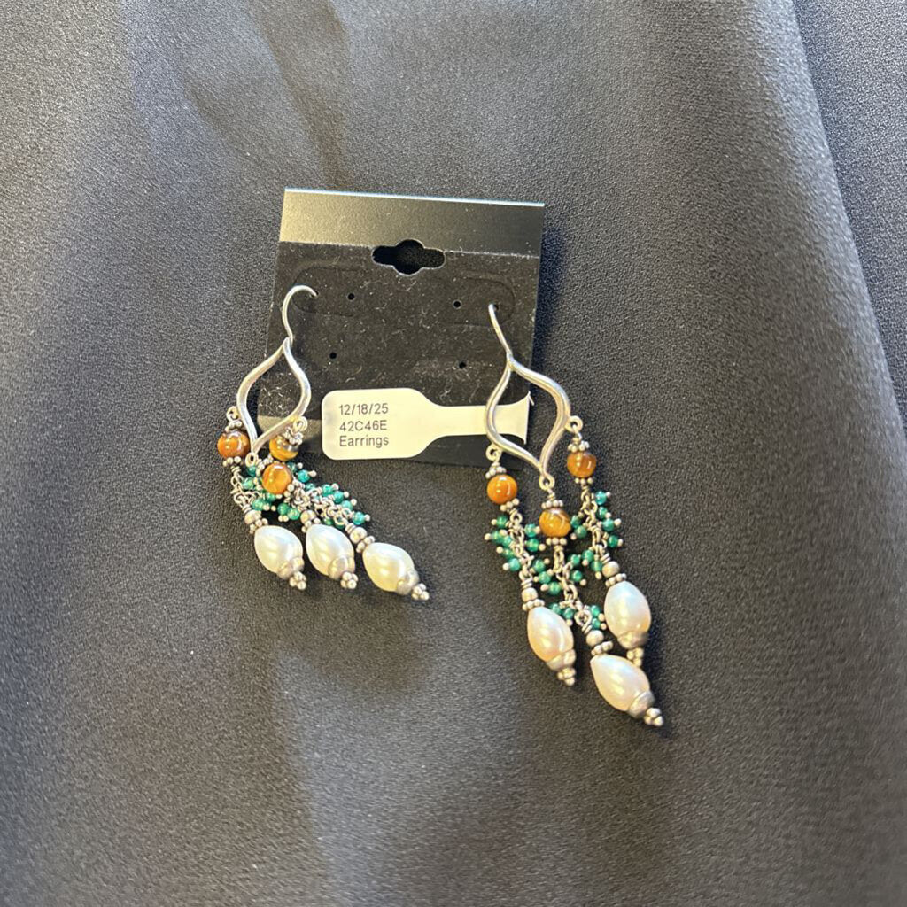 No info from consignor, no markings for silver. Dangle three tiered pierced earrings, multi color beads.