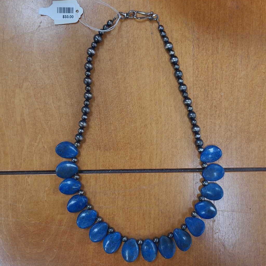 Silver tone beaded necklace with blue lapis stone accents, might be sterling but not marked.