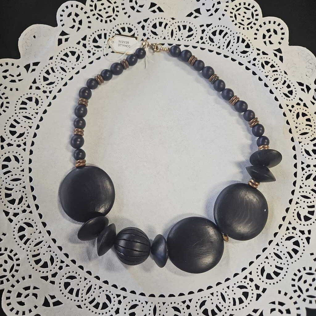 Brown wooden multi shaped beaded necklace with brass tone accents.