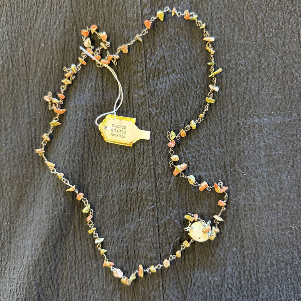 Antique silver tone long necklace with green and coral colored stone chipped necklace.
