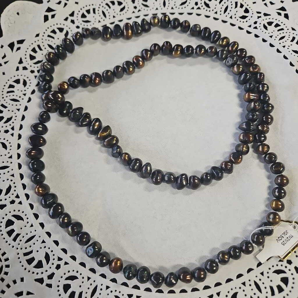 Brown and multi iridescent color freshwater pearl necklace, knotted in between pearls.