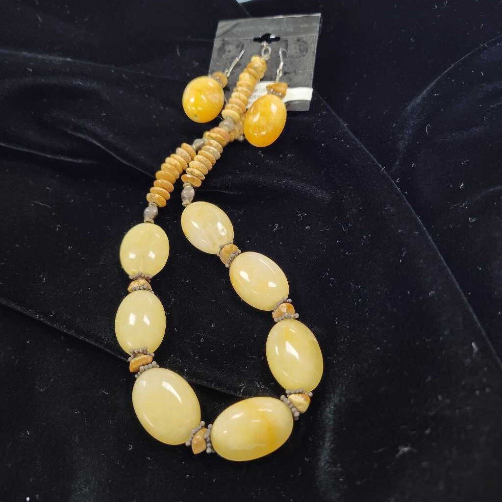 Royal amber and sterling silver necklace with matching dangle pierced earring set.