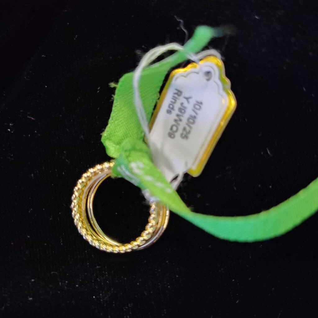 Set of three stackable goldtone rings, one plain, one with rhinestones, and one etched.