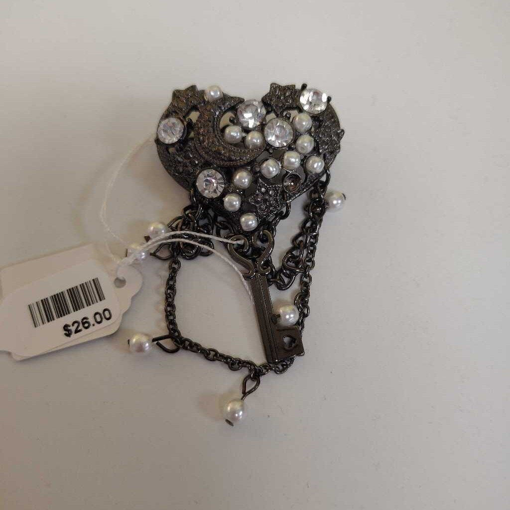 heart pin with key pearl and rhinestones
