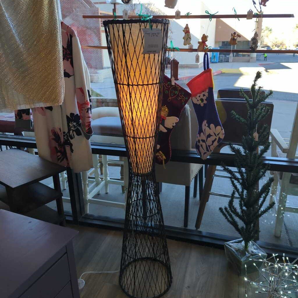 Hour glass shaped weaved basket style. Base is empty while the top has the lampshade.