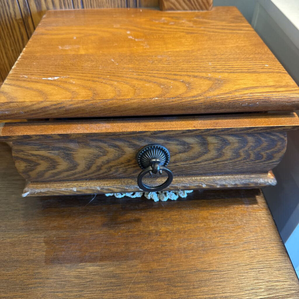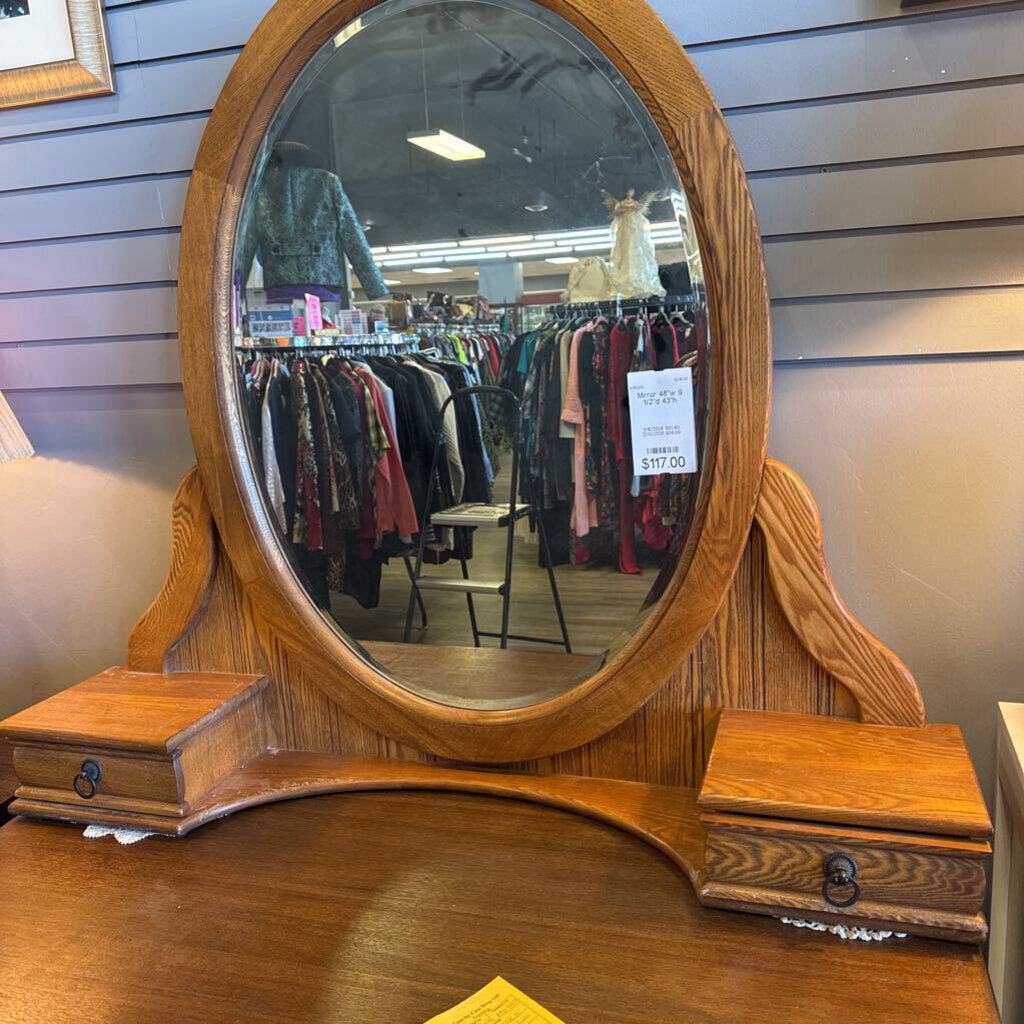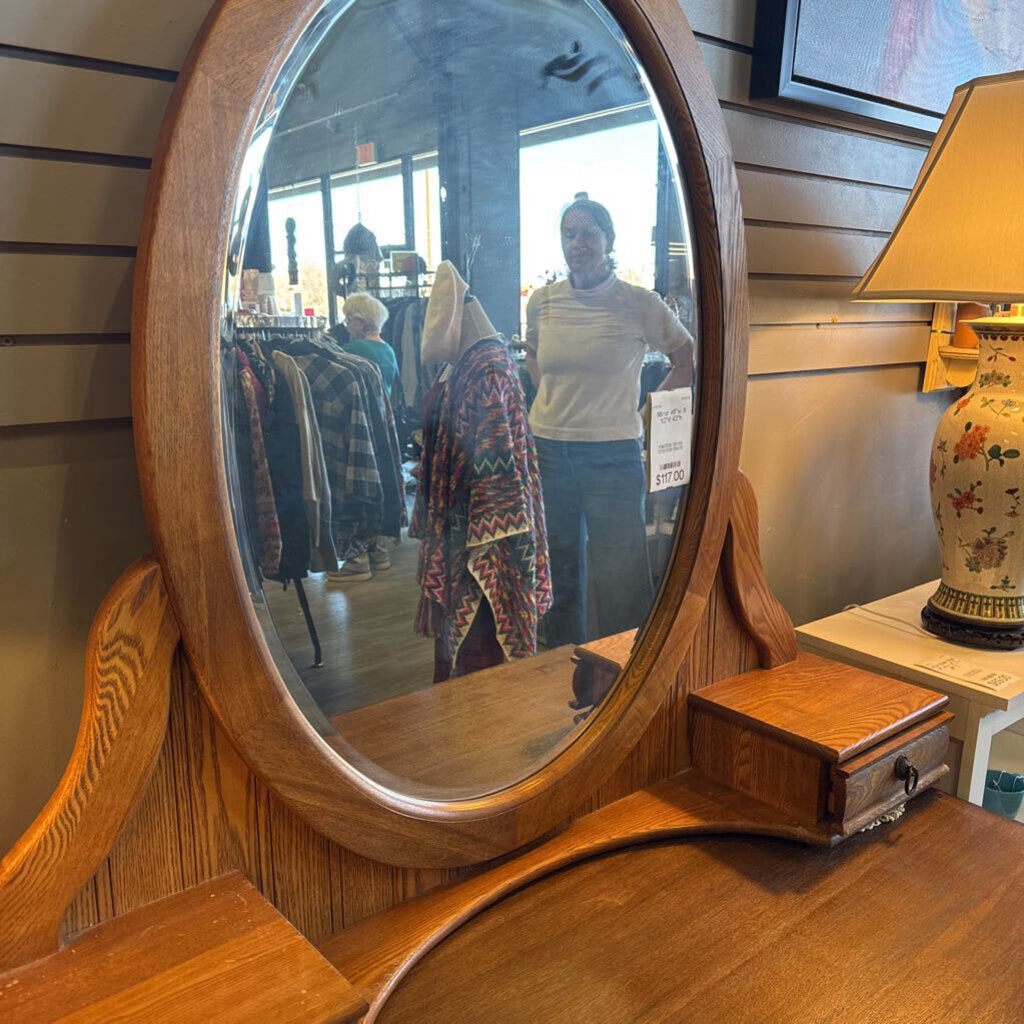 vintage dresser top mirror; solid wood; oval mirror; two drawers