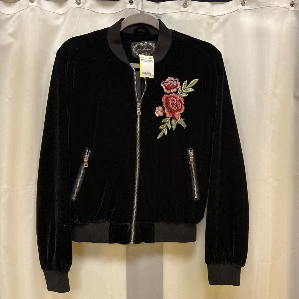 Long sleeve velvet bomber zip front jacket with rose embroidered front and zip front pockets.