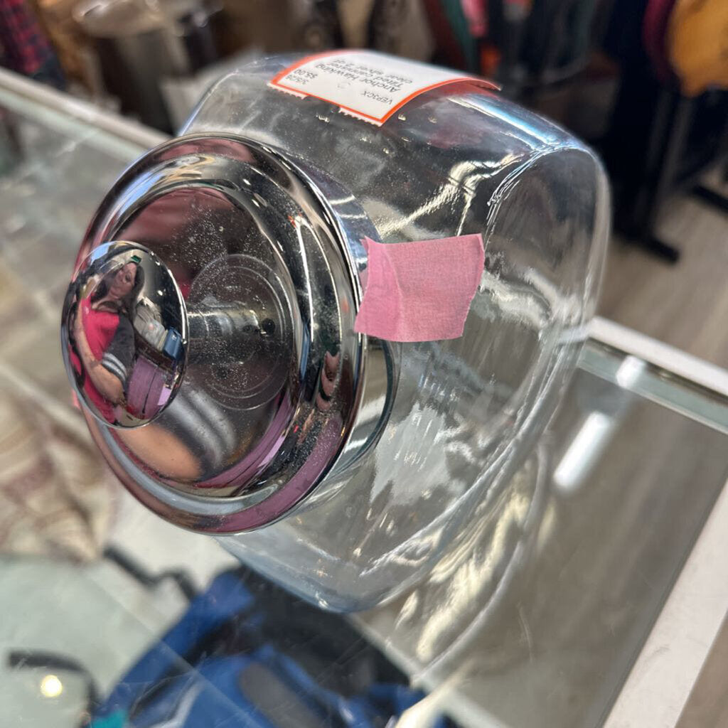 this glass cannister sits on its side and has metal lid; great for candy or dog treats