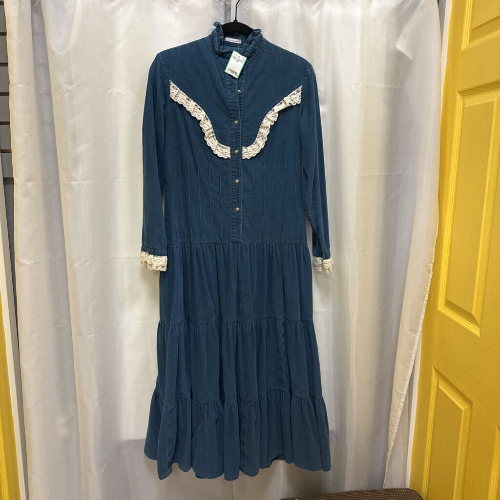 Long sleeve long corduroy tiered skirt dress with button front, ruffle neckline, and contrast ivory lace ruffles.
