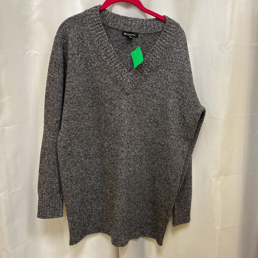 Long sleeve pull over chunky knit sweater with low V- neckline and tunic length.
