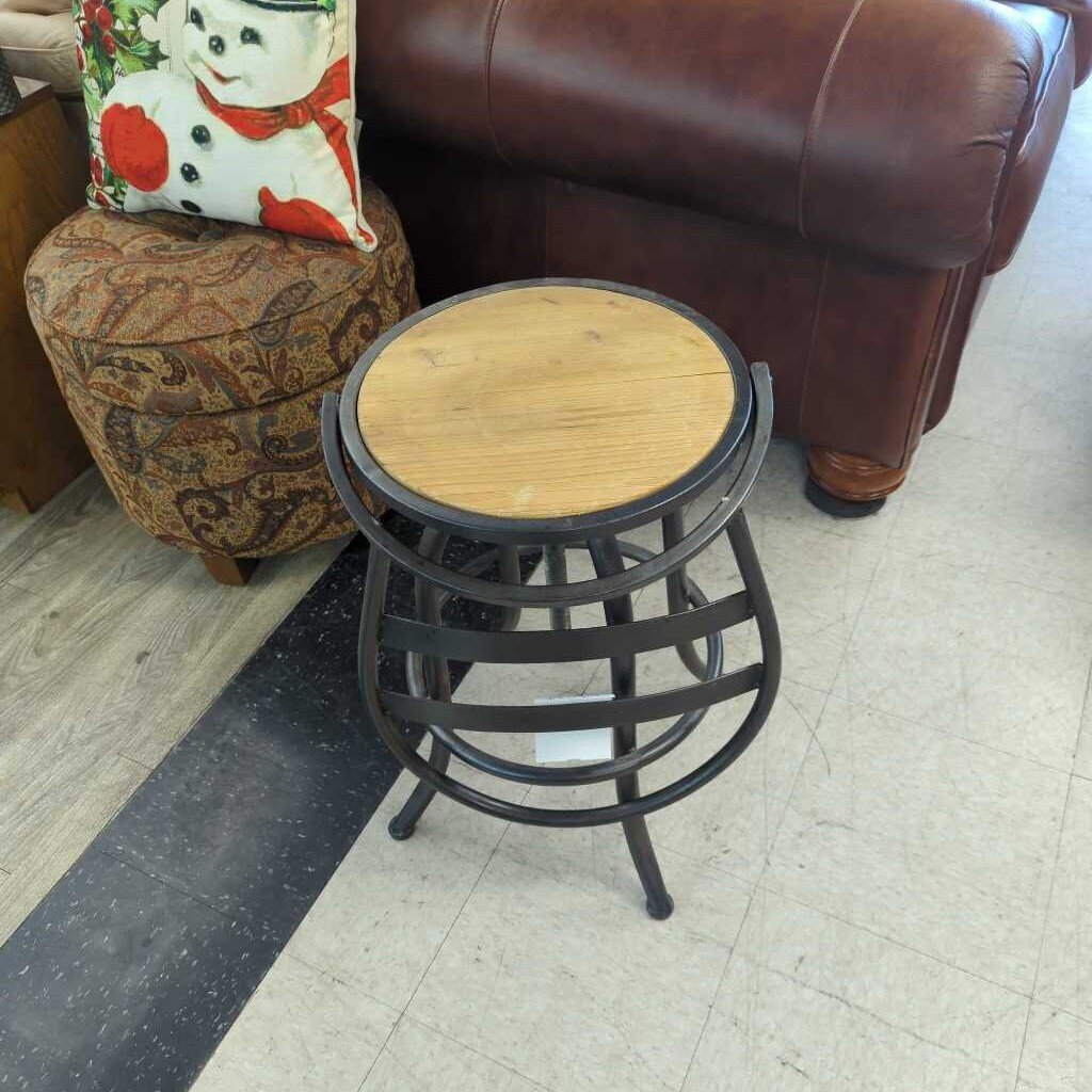 Metal framed stool with metal seat back. Has wooden seat. The seat back folds over to covert into a stool.