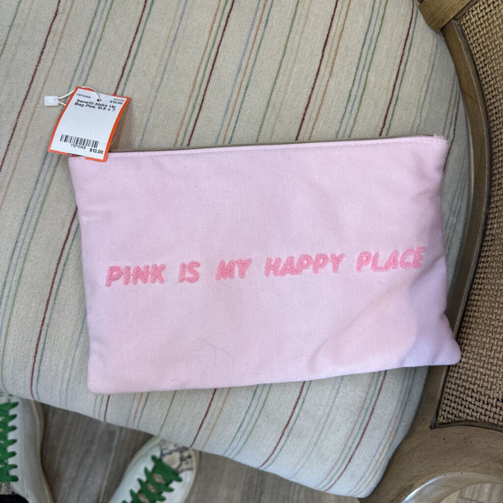 Pink jersey fabric zip top make up bag, "pink is my happy place".