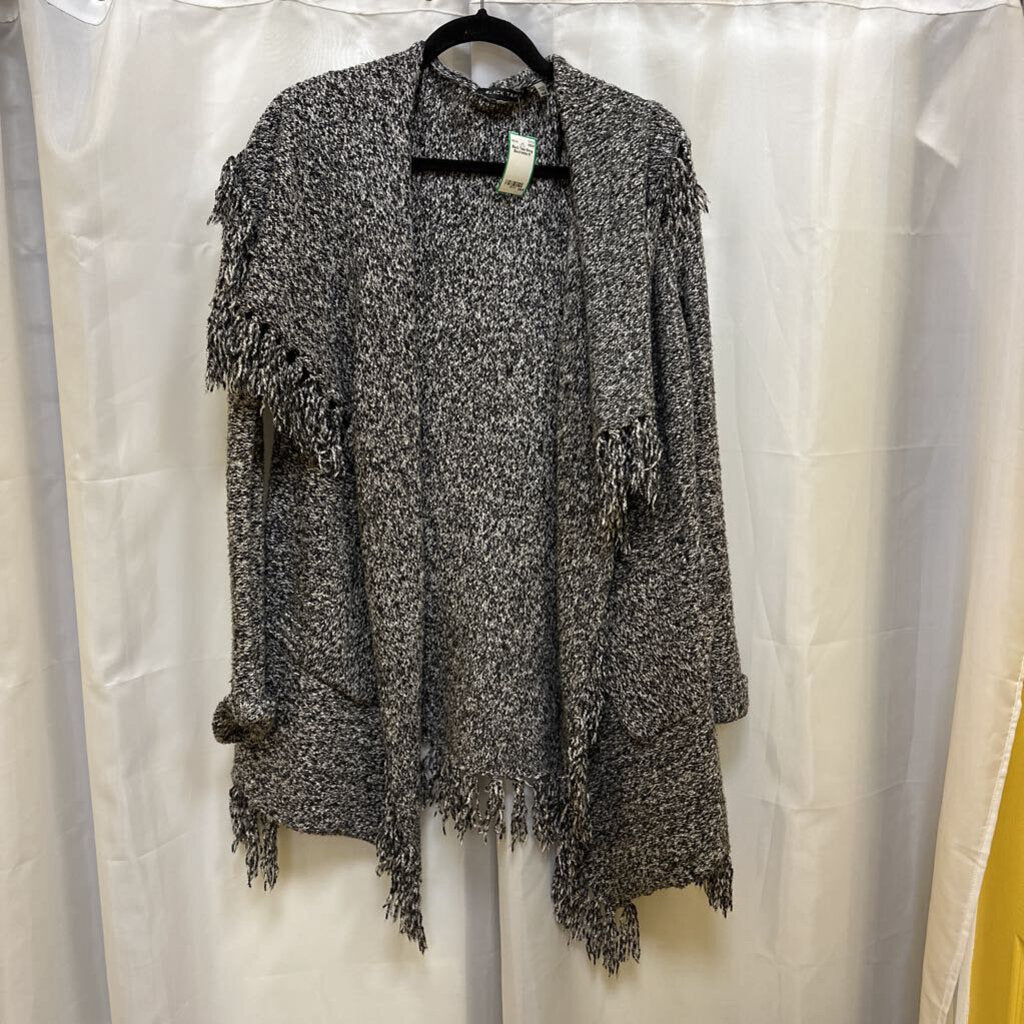 Open, no closure, tassels on hem and center, long sleeves, falls past waist. Cute!