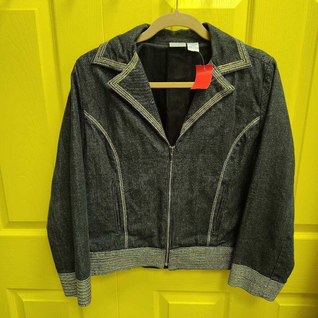 Long sleeve front zip denim jacket with contrast silver and gold metallic stitching, welt front pockets, and notch collar.