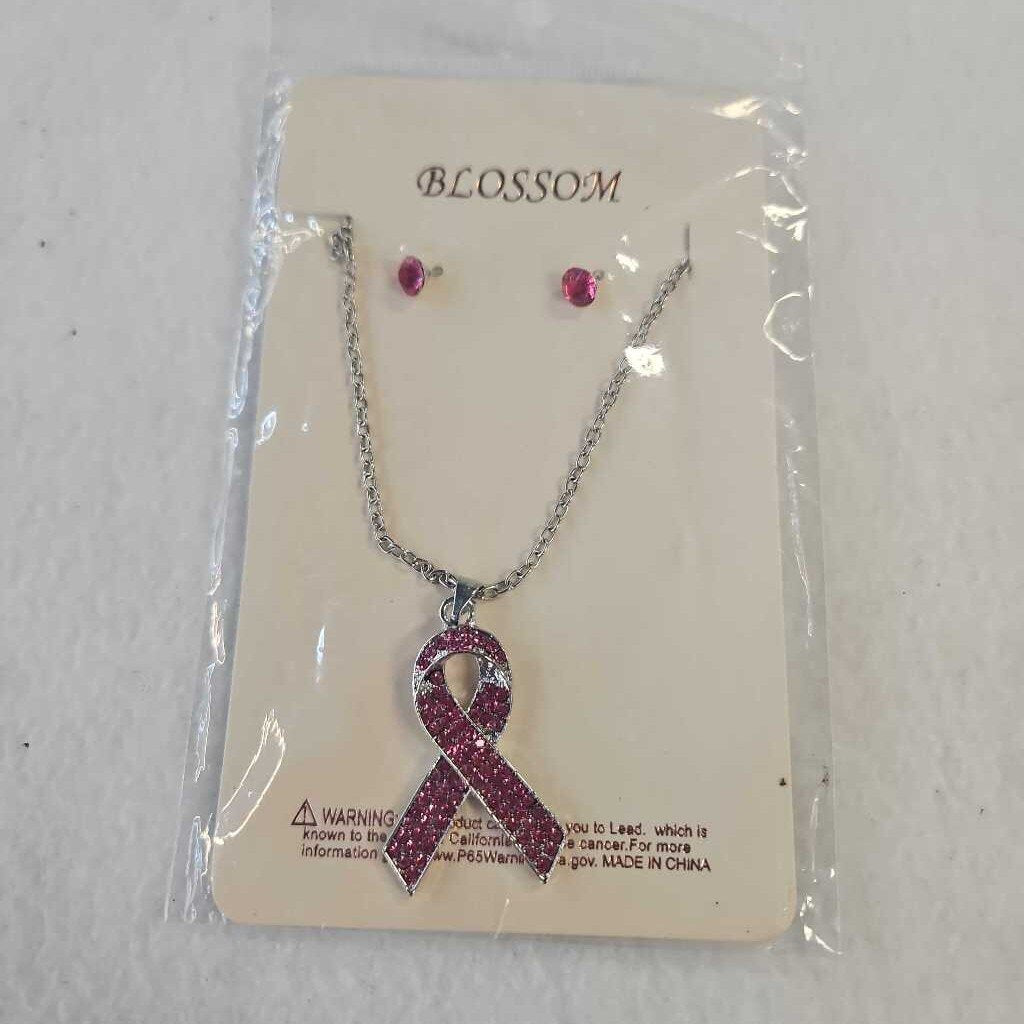 Pink breast cancer ribbon pendant on silver tone chain with pink rhinestone stud earrings, three piece set.