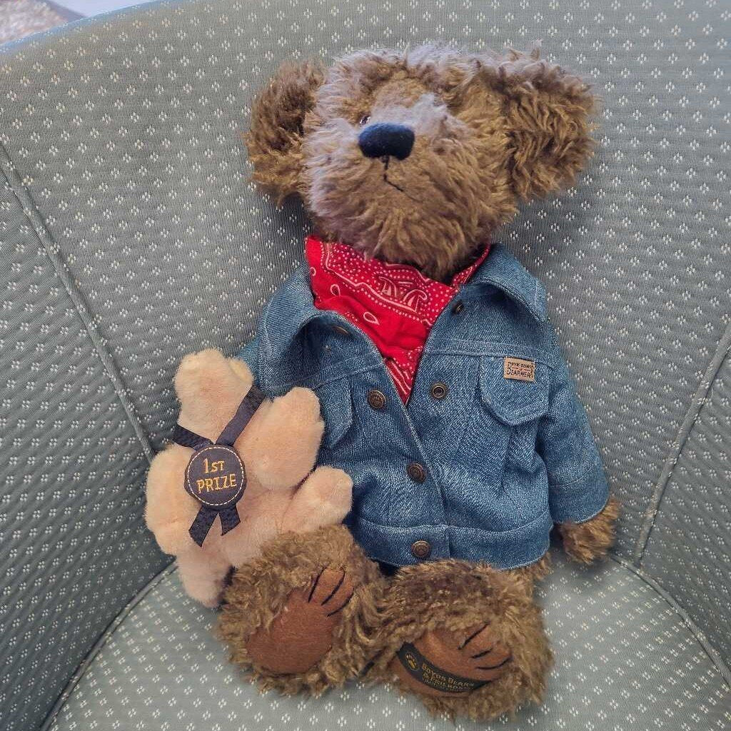 Teddy bear wearing jean jacket and holding a pig on stand.