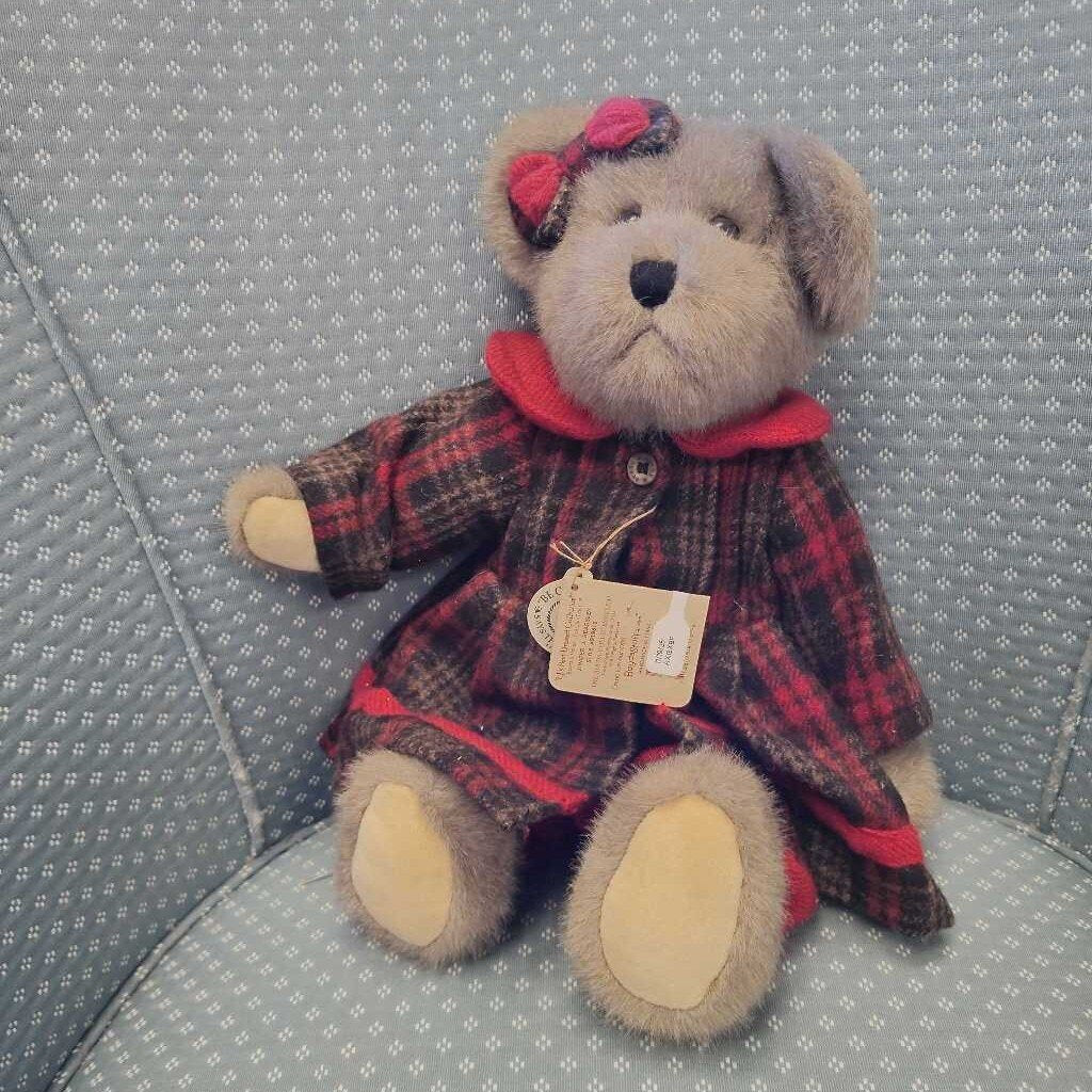 Teddy bear wearing burgundy plaid dress with pants and has a bow.