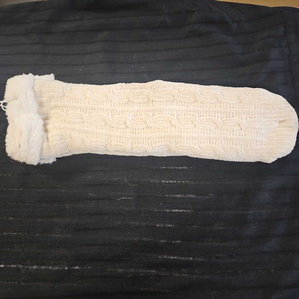 double lined knit socks; hit mid calf; rubber beads prevent slipping