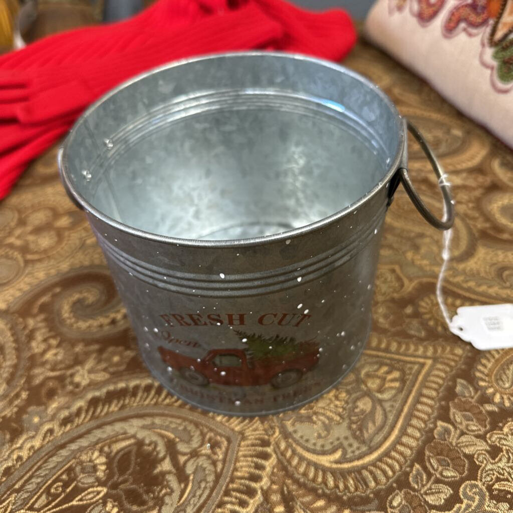 Bucket has handles and a picture of a truck with a Christmas tree in it.