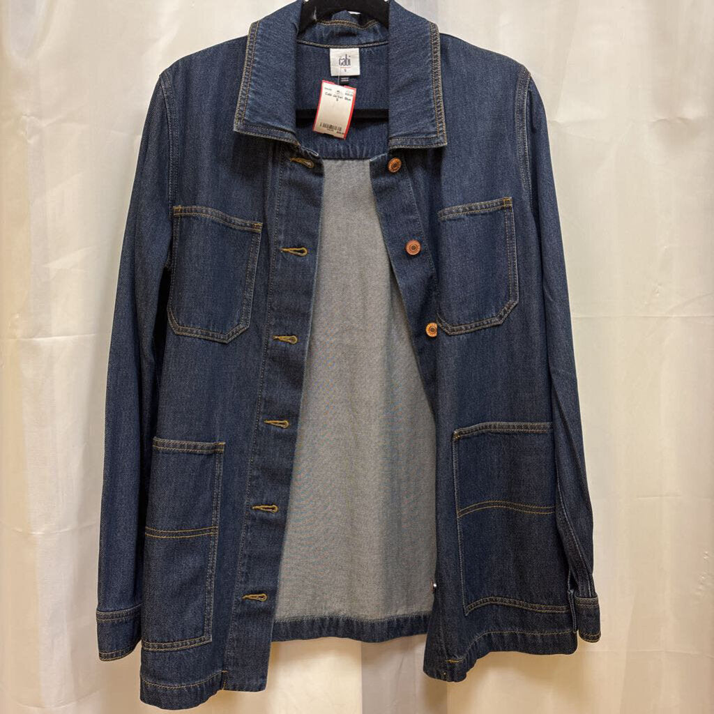 Barn Jacket , denim look . long sleeve thigh length button front with orange contrast stitching