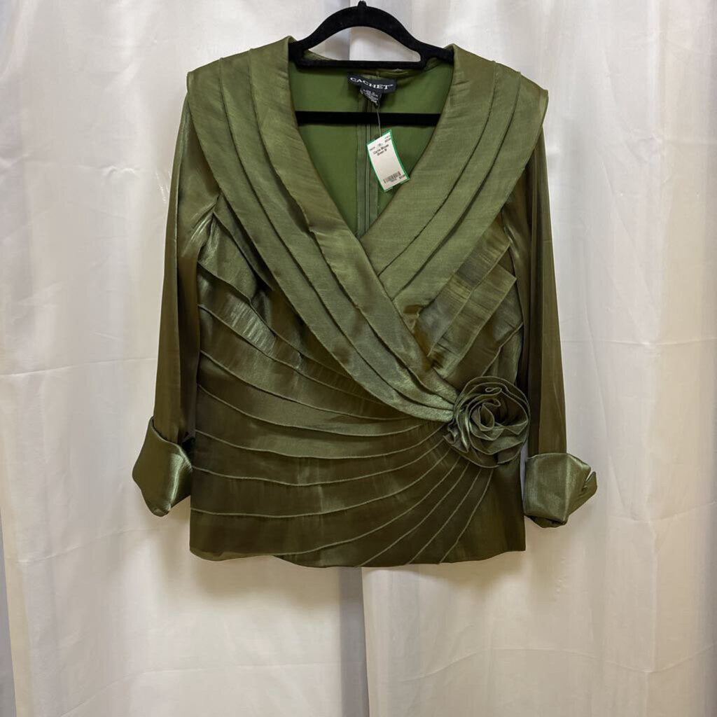 3/4 sleeve green shiny evening blouse with wrap V- neck front, raw edges, and 3D rose details.