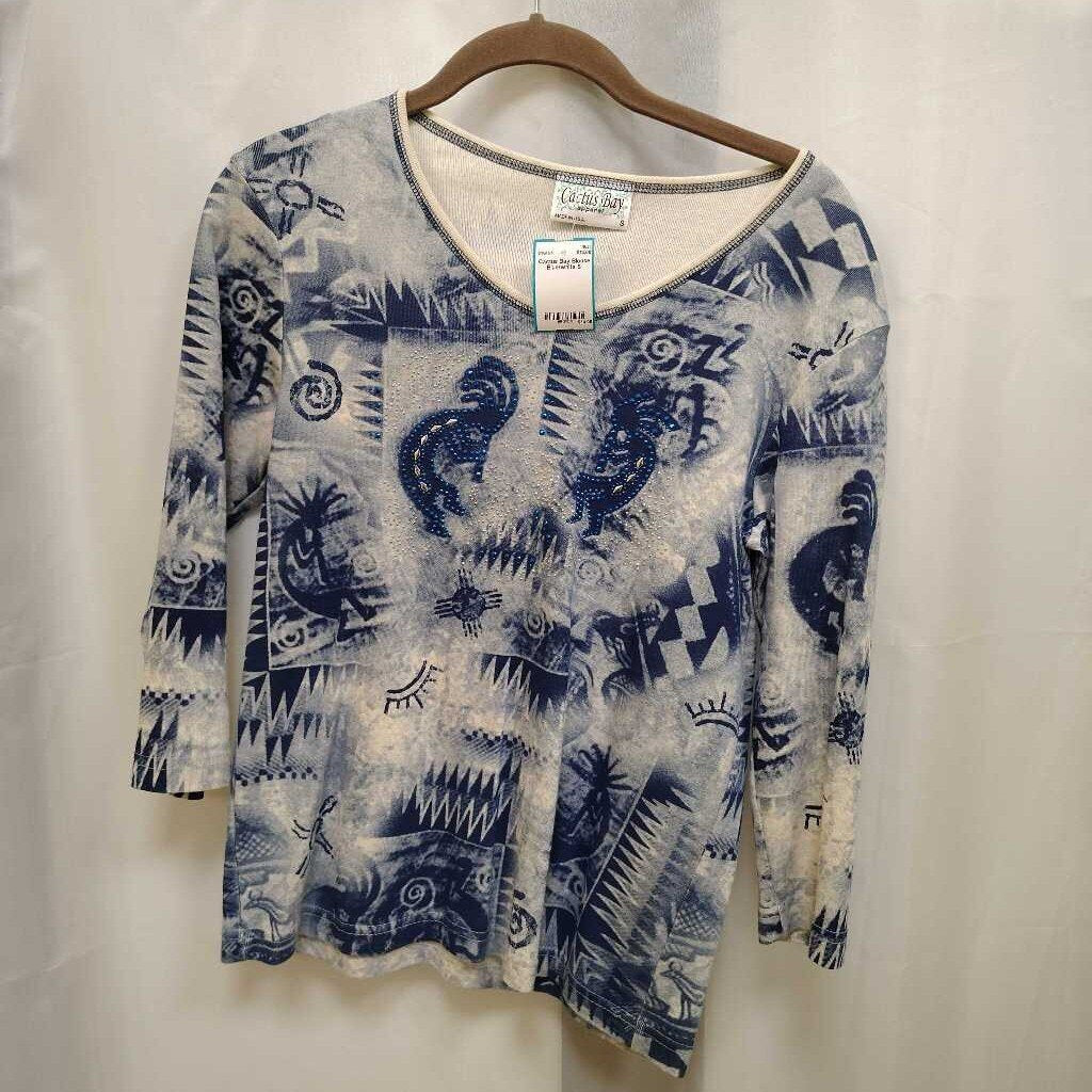 Pull on, 3/4 sleeves, round neck, bead work on front. Abstract design with beaded Kokopelli's on front. Falls past waist.