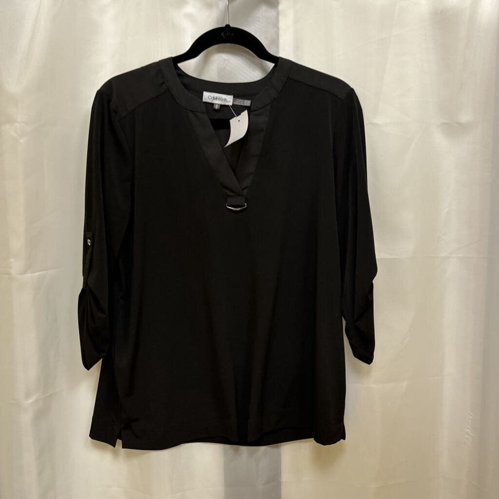 Pull on, 3/4 sleeves, silver tone hardware in front, vneck, falls past waist.