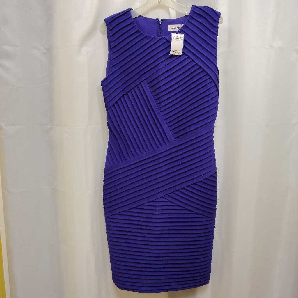 Sleeveless short pleated knit dress with solid back and high neckline.