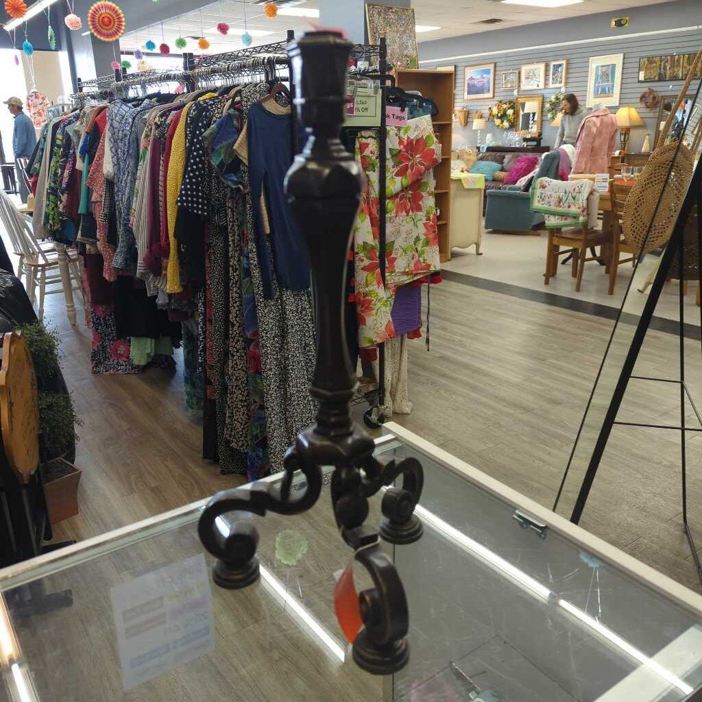 Base is 3 pronged with flourishes. Metal.
