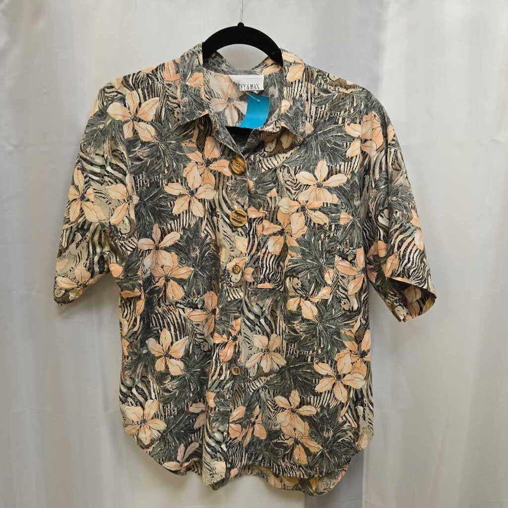 Short sleeve tropical floral printed button front shirt with one pocket detail.