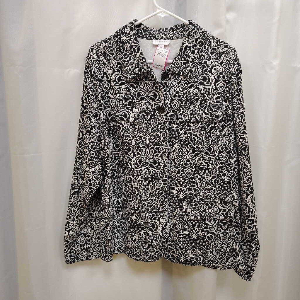 Button down w/collar, long sleeves, White design on black. Two pockets. Falls past waist.