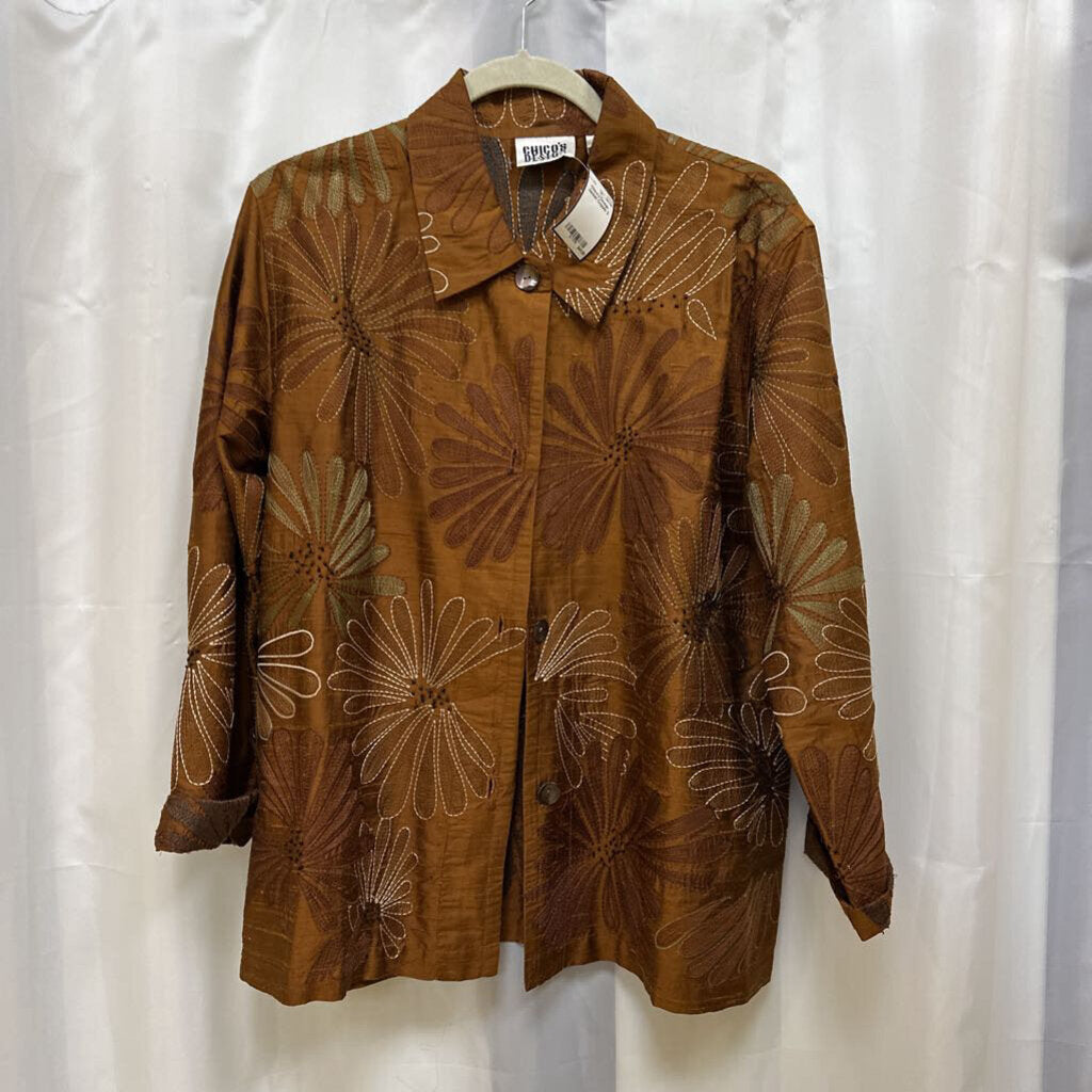 Long sleeve all over embroidered daisy pattern button front jacket with beaded trim.