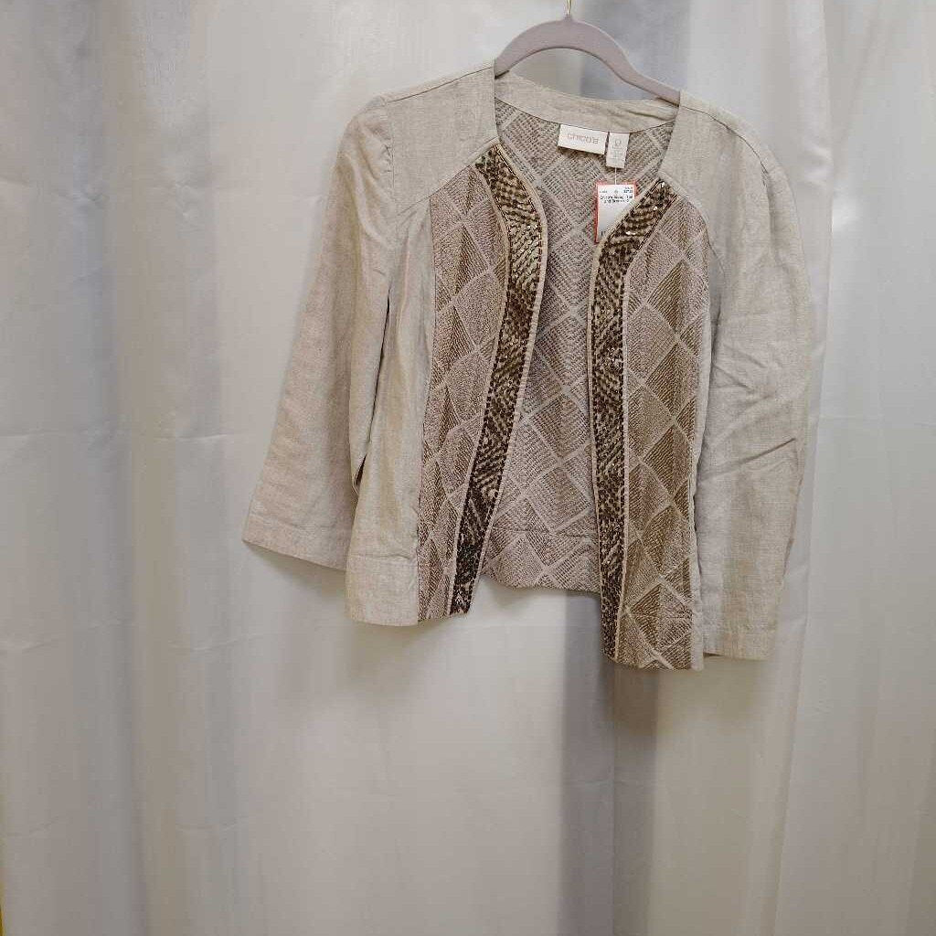 Linen , long sleeve waist length with stitching in square pattern , various size and shape beading accent