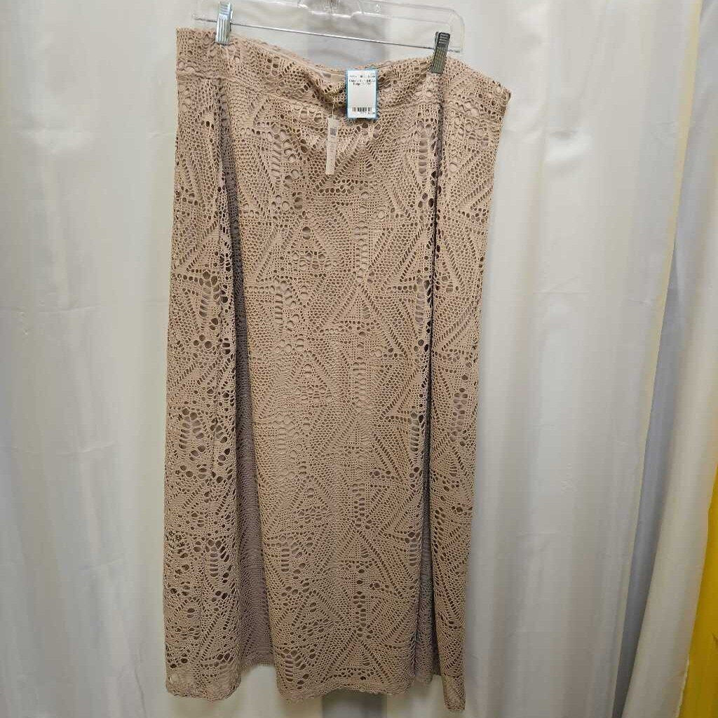 New w/tags. Elastic waist, pull on Lined beige with crochet over lay design. Slit in front, falls to ankles.