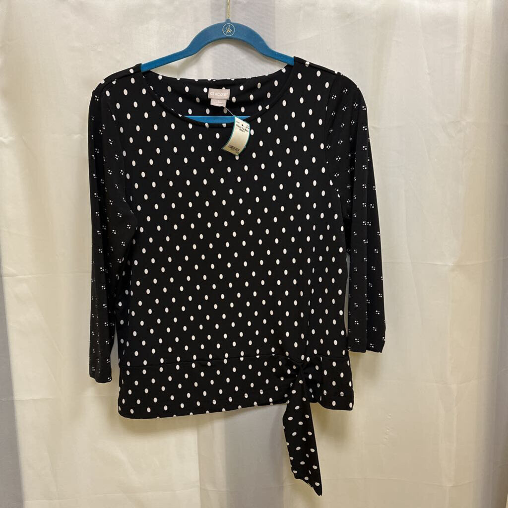 3/4 sleeve pull over polka dot tee with contrast printed sleeve and side tie hem detail.