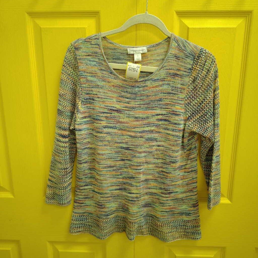 3/4 perforated fabric sleeves, pullover. multicolor with perforated fabric around bottom.