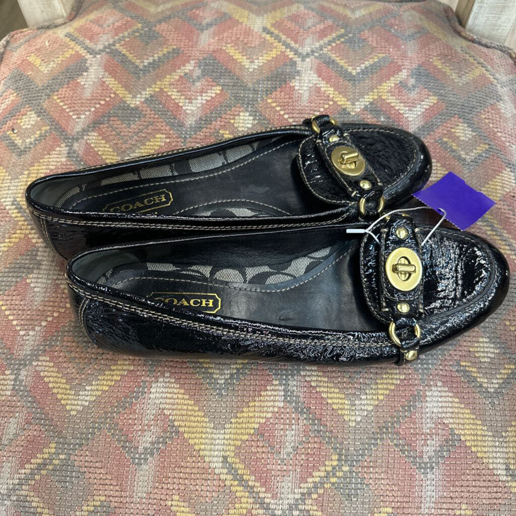 Black patent leather slip on flat shoes by Coach with turn lock detail.