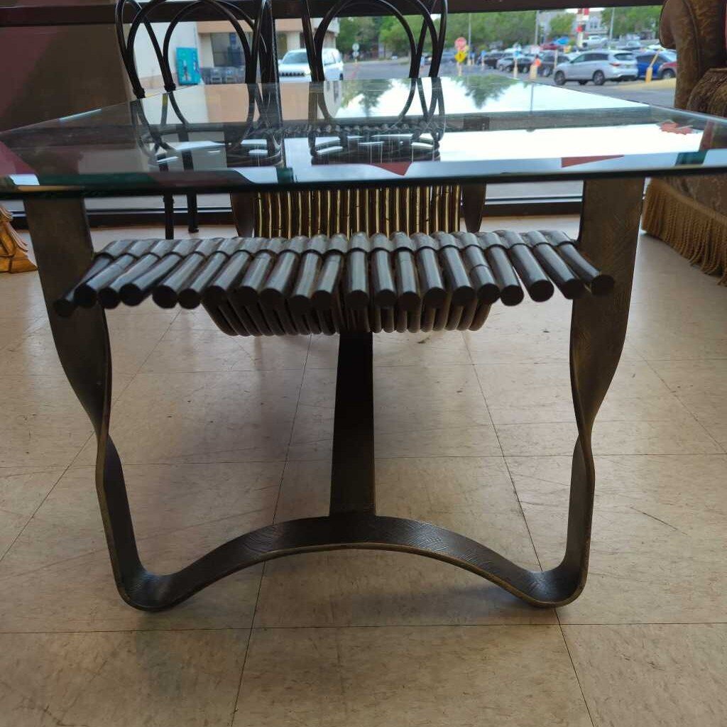 metal base looks like bent bamboo; floating glass table top has beveled edge; each corner of glass is chipped