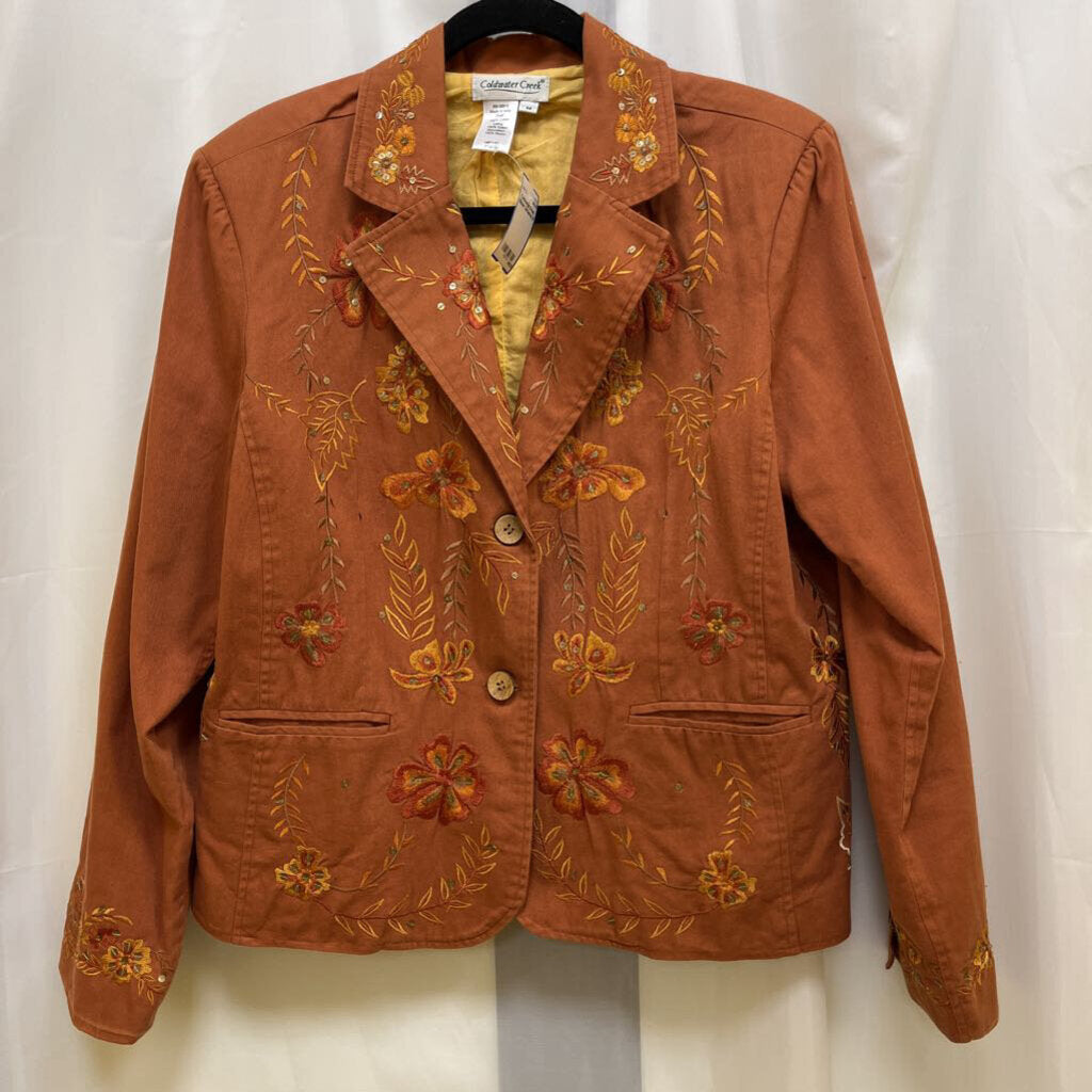 Long sleeve button front floral embroidered blaze with welt pockets, notch collar, and contrast yellow lining.