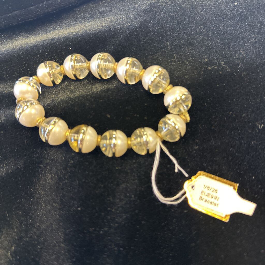 Pearl and silver tone and clear full ball stretchy bracelet.